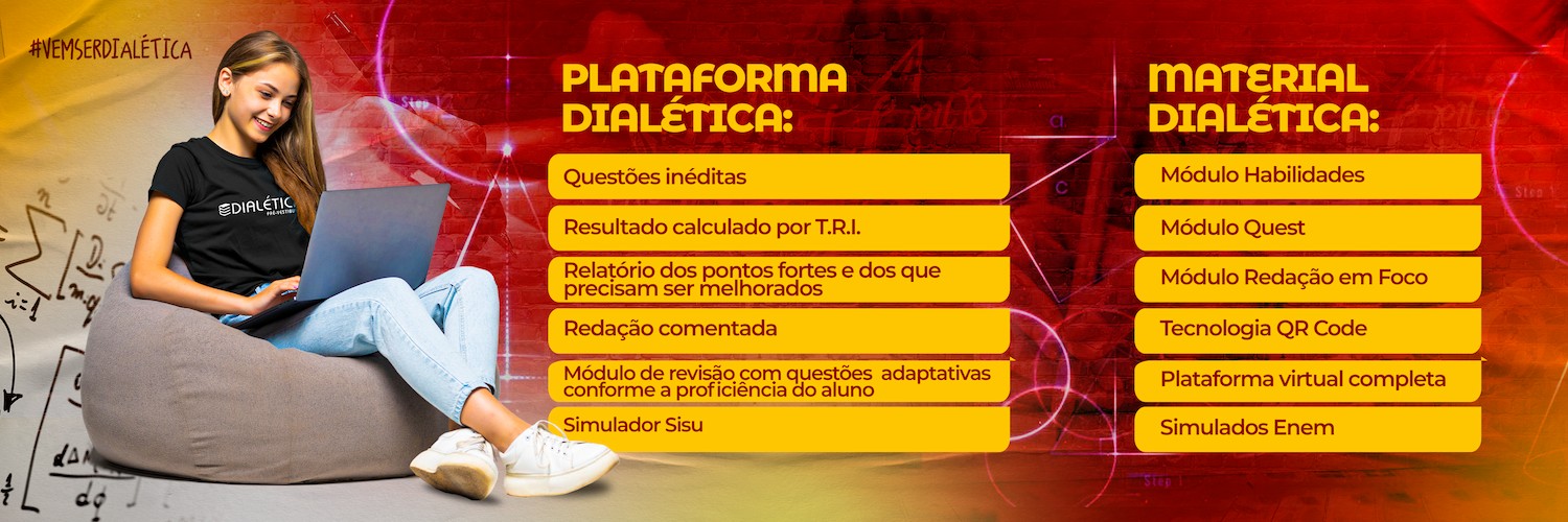 Este é o Dialética Quest, um material de atividades suplementares. Aqui, você terá acesso a exercícios de fixação que contemplam os conteúdos estudados no Dialética Habilidades. Ao desenvolver as questões propostas neste material, você poderá se organizar e revisar os conteúdos aprimorando, assim ,o seu aprendizado e a sua habilidade de interpretação de informações. Desejamos que você aproveite esse material e os conhecimentos contidos nele, exercitando as atividades que serão apresentadas.